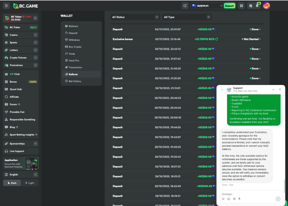 Support chat with Erica: Confirmed no NZD withdrawal, no fiat-to-crypto conversion available, no manual processing, no alternatives. Just "wait for updates" with no ETA.