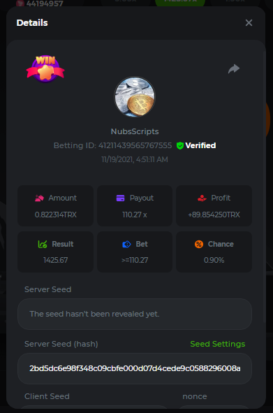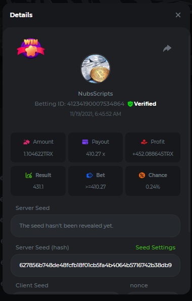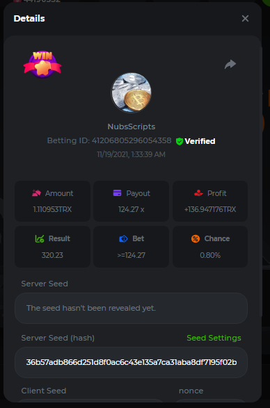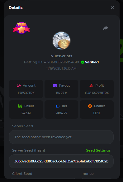 4. The get history has always loaded the previous 20 rolls. The only way to load more is to get from verification site which is beyond me. It grabs those 20 previous rolls because that's 20 more than just pressing Start and we want to see some sort of pattern before betting. It now adjusts the bet according to losses. The Update won't show correct Profit as the ability to call the currency.amount returns the same amount as when the script 1st started. To me this is old and spaghetti looking with crap all over it. This style of betting based upon losses generates a certain level of profit, but is not even close to basing bets on the Streaks % and pausing betting when no streaks. //******************* Nubs27's Smart Script for Crash ******************* // // // // If you find this script helpful please consider donating to Nubs27 or tipping on NanoGames.io: // Referral Link: https://n-luzqe.nanogames.io/ // // Donations accepted in many coin/token types. List & Addresses: // https://sites.google.com/view/nanogamescrashscripts/home/donation-addresses // // // var config = { mainTitle: { label: '*** Nubs27\'s Smart Script for Crash ***', type: 'title' }, auto: { label: '', value: 'Script', type: 'radio', options: [ { value: 'Script', label: 'Script chooses Base Bet'}, { value: 'Player', label: 'Player chooses Base Bet'} ]}, bet: { label: 'Base Bet', value: currency.minAmount, type: 'number' }, lossTitle: { label: 'Stop When ', type: 'title' }, stop: { label: 'Coins Lost >', value: 1, type: 'number' }, end: { label: 'Minutes >', value: 250, type: 'number' }, profit: { label: 'Profit >', value: 100, type: 'number' }, }; function main () { //PayOuts checked in the Stats Update const MultiplierArray = [2.5, 3.00, 5.00, 6.00, 7.00]; const LMultiplierArray = [10.00, 20.00, 50.00, 100.00]; var version = "v2.3"; var PayOutPercents = []; var PayOutConfidence = []; var Array2Filter = []; var FilteredArray = []; var ScriptHistory = []; var Trains = []; // Red Train IDs - finding gaps between & correlation between gap & duration var History = []; var RoundsPlayed = 0; var RoundsViewed = 0; var LastGameID = 1; var CurrentGameID = LastGameID + 1; var MinimumBet = currency.minAmount; var MaxBet = (currency.amount / 10); var TotalBets = 0; var CurrentMultiplier = MultiplierArray[1]; var LastMultiplier = MultiplierArray[1]; var MaxLossesEncountered = 3; var MostLost = 0; var LargestMulitplier = 2; var BaseBet = config.bet.value; var CurrentBet = BaseBet; var LastBet = BaseBet; var LastShrek = CurrentGameID; var LastTrain = 0; var Gap = 0; var AverageGap = 0; var LargestBet = [0,0]; var Enable100ID = 1000000; var LastResult = "Won"; var CoinLost = 0; var StopLossCoin = config.stop.value; var Losses = 0; var Wins = 0; var Red = 0; var Green = 0; var StartTime = new Date(); var EndTime = new Date(); var TimeDiff = (EndTime - StartTime); var StartBalance = currency.amount; var EndBalance = 0; var Profit = 0; var ATHProfit = 0; var ProfPerMin = 0; var NetProfit = 0; var DisplayGreeting = "False"; var GotHistory = "False"; var BetYet = "False"; var LoggedBetData = "False"; var GameInfoLogged = "False"; var StrategyFound = "False"; var IsPlaying = "False"; var UpdateBets = "False"; var Enable100 = "False"; var LastCrash = 0; var PrevCashOut = 0; var WonAmount = 0; var FindThisMultiplier = 1; var FindShouldHave = 2; var ThisAverage = 1; var HistorySlice = 50; var Paused = "True"; var IndexMax = PayOutConfidence[0]; var MaxIndex = 0; var GetNumber = 0; // Welcome the Player to the Script console.clear(); engine.on('GAME_STARTING', function () { if (DisplayGreeting == "False") { log.info(' Nubs27s Smart Script for Crash'); log.info(" ****************"); log.info("See Web Console for more Information (Press F12)"); console.log('%c~~~~~~~~~~~~~~~~~ Nubs27\'s Smart Script for Crash ~~~~~~~~~~~~~~~~~','color:Purple; font-weight:bold'); console.log('%cScript Start Time: ' + StartTime,'color:Purple; font-weight:200'); console.log(' %cWelcome ' , 'color:Purple; font-weight:bold'); console.log(' %cYour Starting Balance is: ' + StartBalance + ' ' + currency.currencyName, 'color:Purple; font-weight:bold'); if (config.auto.value == 'Player') { if (config.stop.value > currency.amount) { MaxBet = (currency.amount / 10); config.stop.value = currency.amount * 0.98; console.log('%c[WARNING]: Stop Loss is above your Bankroll','color:Orange; font-weight:bold'); console.log('%c[WARNING]: Stop Loss Updated to ' + config.stop.value, 'color:Orange; font-weight:bold'); } if (config.bet.value > (config.stop.value / 15000)) { log.info('[WARNING]: Script Recommends a bankroll of at least ' + (BaseBet * 15000) + '' + currency.currencyName + ' for the Base Bet you provided'); log.info('[WARNING]: Script Recommends a bankroll of at least ' + (BaseBet * 20000) + '' + currency.currencyName + ' for the Base Bet you provided'); log.info('[WARNING]: Script Recommends a bankroll of at least ' + (BaseBet * 25000) + '' + currency.currencyName + ' for the Base Bet you provided'); } console.log(' %cYou Input: ' + BaseBet + ' ' + currency.currencyName + ' as the Base Bet', 'color:Purple; font-weight:bold'); }else{ betupdate(); console.log(' %cYour Starting Base Bet is: ' + BaseBet + ' ' + currency.currencyName, 'color:Purple; font-weight:bold'); } console.log(' %cYour Stoppers are: Coin Lost > ' + config.stop.value + '; Minutes > ' + config.end.value + '; Profit > ' + config.profit.value, 'color:Purple; font-weight:bold'); console.log('%c~~~~~~~~~~~~~~~~~~~~~~~~~~~~~~~~~~~~~~~~~~~~~~~~~~~~~~~~~~~~~~~~~~','color:Purple; font-weight:bold'); if (config.stop.value > currency.amount) { MaxBet = (currency.amount / 10); config.stop.value = currency.amount * 0.95; console.log('%c[WARNING]: Stop Loss Updated to ' + config.stop.value, 'color:Orange; font-weight:bold'); } } DisplayGreeting = "True"; if (GotHistory == "False") { getnanohistory(); GotHistory = "True"; console.log(ScriptHistory); LastShrek = []; LastTrain = []; } // // // //Everything above here only run