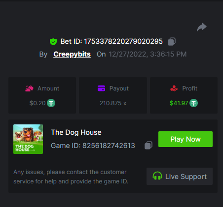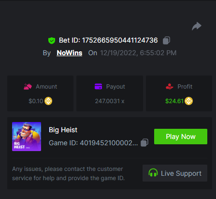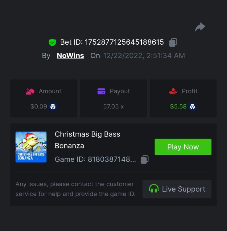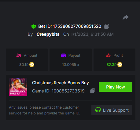 9. So many games to keep track of these days. This is just preliminary, and for my own sake to see what I've done Sugar rush - 1789.25x Gates of Olympus - 537.25x Sweet bonanza - 879.99x Madame Destiny Megaways - 592.75x Starlight Princess - 1258.31x Santa’s Great Gifts - 421.70x Bigger Bass Blizzard - Christmas Catch - 475.93x Pizza! pizza? pizza! - 600.03x Sweet powernudge - 1118.56x Hot pepper - 419.11x Fury of Odin megaways - 1069.53x Super joker - 189.97x https://bc.game/#/sd/110MGAL2XS7LSJ https://bc.game/#/sd/110FLLJMTWFGUR https://bc.game/#/sd/110KEWRKP5Y9LF https://bc.game/#/sd/110BOIZ04T5DZN https://bc.game/#/sd/110BSJPWHB0AVN https://bc.game/#/sd/110M42STGBYYHF https://bc.game/#/sd/110MX5W6CNXVRN https://bc.game/#/sd/110HTIASYG4S2B https://bc.game/#/sd/110MAWMRYEXV6B https://bc.game/#/sd/110K3EY69MGWER https://bc.game/#/sd/110M2R1YE4WZYR https://bc.game/#/sd/110I8VYSQ5DKIB BOUNTY https://bc.game/#/sd/110BYHKFG8ETQR
