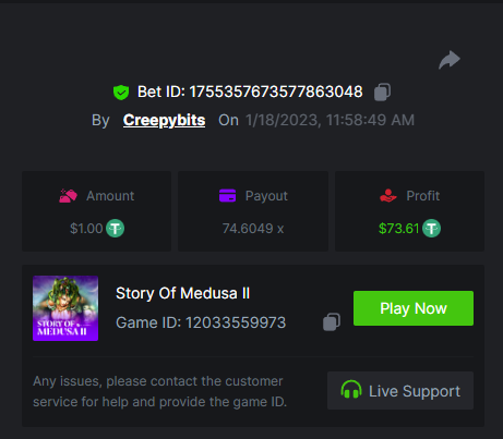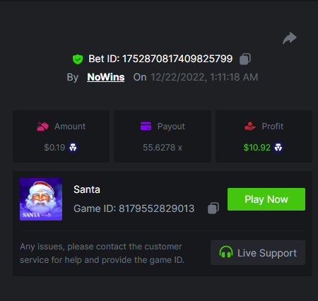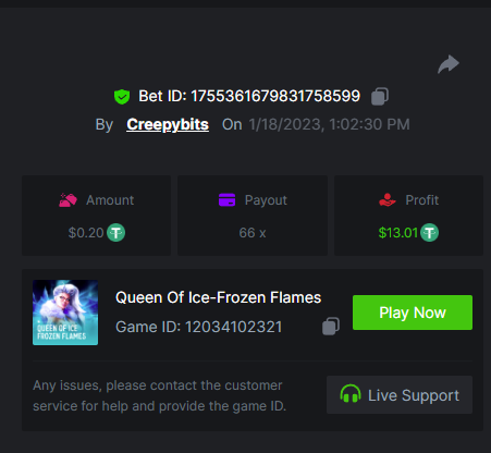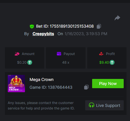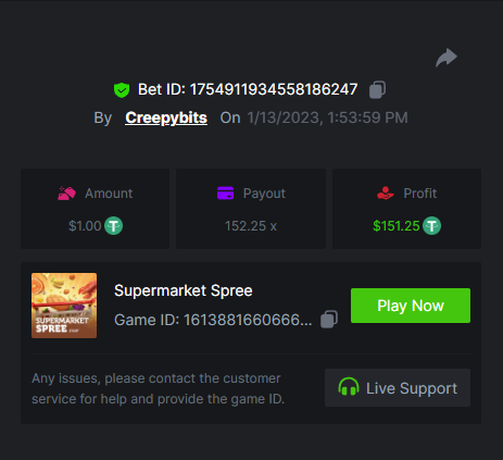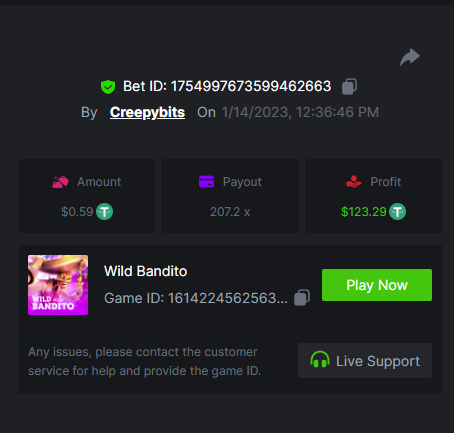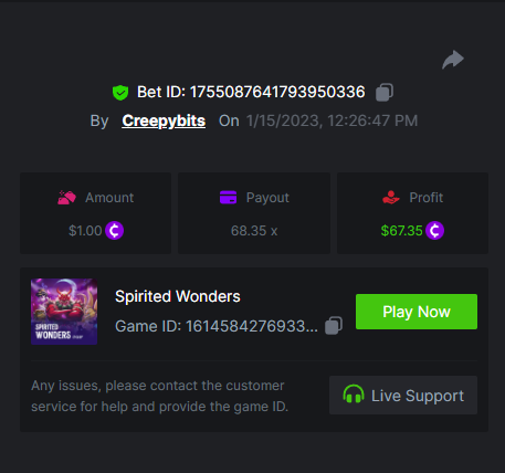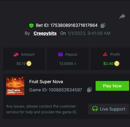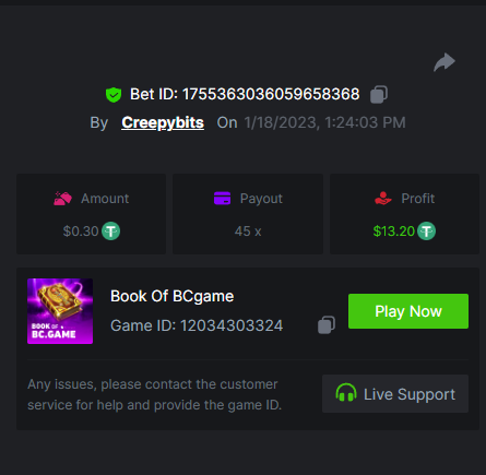 6. -- Just to keep track -- Wild Bounty Showdown - 945.7x Candy Bonanza - 102.4x Leprechaun Riches - 98.75x Spirited Wonders - 68.35x Butterfly Blossom - 135.44x Supermarket Spree - 152.25x Wild Bandito - 207.2x Destiny of Sun and Moon - 111.4x Prosperity Fortune Tree - 210.15x Legendary Monkey King - 84.6x -- -- -- -- -- -- -- -- -- -- -- -- https://bc.game/#/sd/111MI4BCN45A8J https://bc.game/#/sd/1118N98VQ6YOLV https://bc.game/#/sd/111FLN8H2KMUXF https://bc.game/#/sd/1117ZLODNLU13N https://bc.game/#/sd/111ASNM3GZTLOZ https://bc.game/#/sd/111E79UVO7INMB https://bc.game/#/sd/111D534T8YKE1F https://bc.game/#/sd/111ECYHMTQN09F https://bc.game/#/sd/111LTQM7BZ1TEB https://bc.game/#/sd/111D33QIXPOU1F BOUNTY