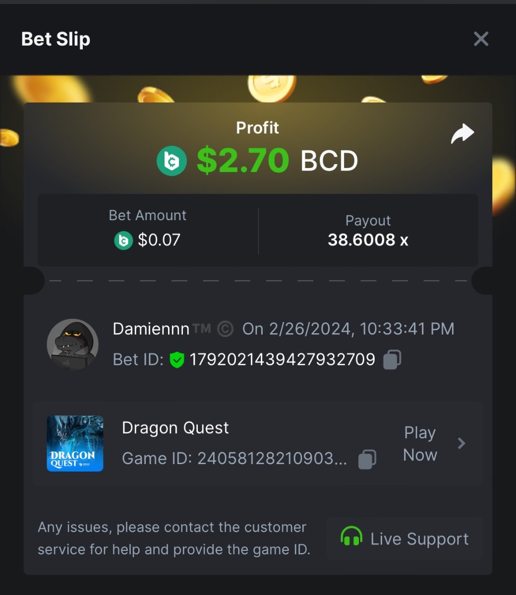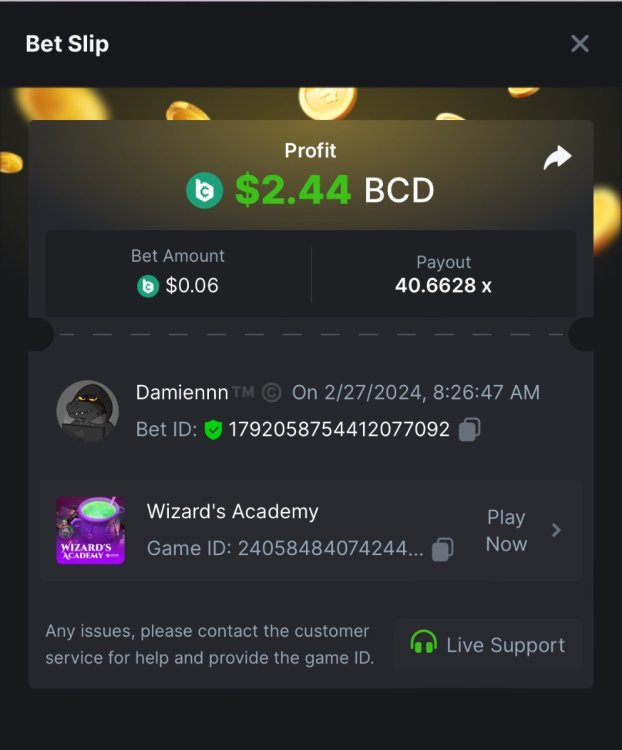 4. BC Original Slot Multiplier Challenge -Dragons Quest (BC Original) 38.60x - $0.07 bet https://bc.game/#/sd/11THSBRD7TH653 -Wizards Academy (BC Original) 40.66x - $0.06 bet https://bc.game/#/sd/11TISVBB68NZWZ