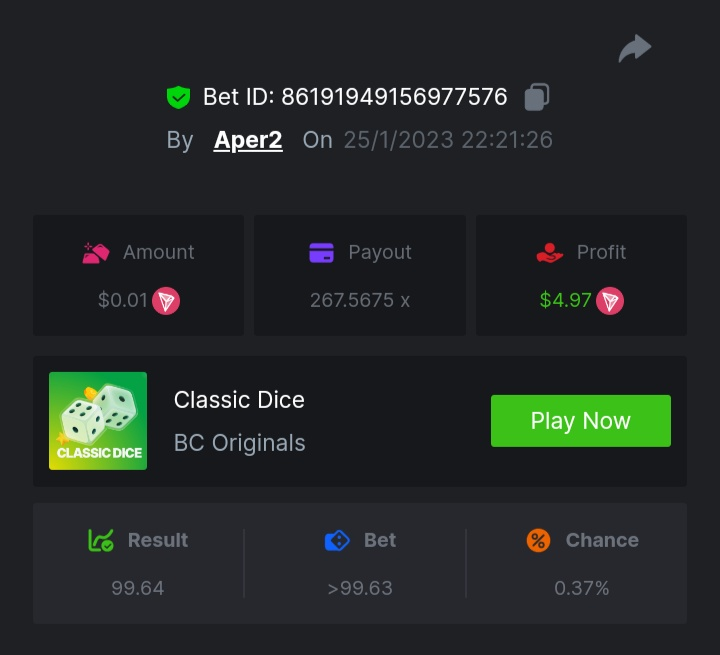 Black Tiger Posted January 26, 2023 Share Posted January 26, 2023 Read Carefully Before Start To Hunt Daily Challenges #142: Classic DiceHunt :Win the highest pay outMin Payout requirement 100xMin Level 4️Duration Starting : Now End time : 23.59 UTC Time How to Join? Make screenshot + paste your bet link + UID or Profile link Minimum bet amount - 0.01$ Any coin allowedReward Prizes 1st Place....... $7 BCD2nd Place..... $5 BCD3rd Place...... $4 BCD 🎖4th Place......$3 BCD5th - 10th Place......$1 BCD 🏵 Winners will be announcing next day after Roll Point Link to comment Share on other sites More sharing options...